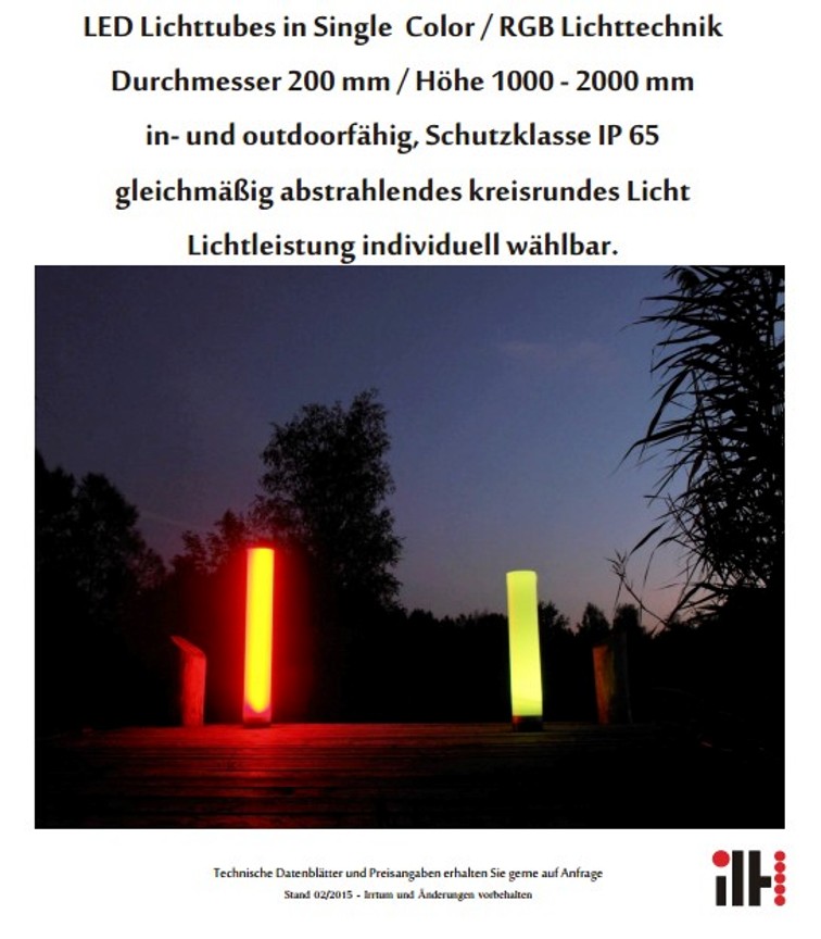 LED Lichttubes in Single Colour (Einzelfarben) RGB Lichttechnik. Durchmesser 200 mm, Höhe 1.000 bis 2.000 mm. Indoor und Outdoorfähig, Schutzklasse IP 65. Gleichmäßig abstrahlendes kreisrundes Licht. Lichtleistung individuell wählbar.